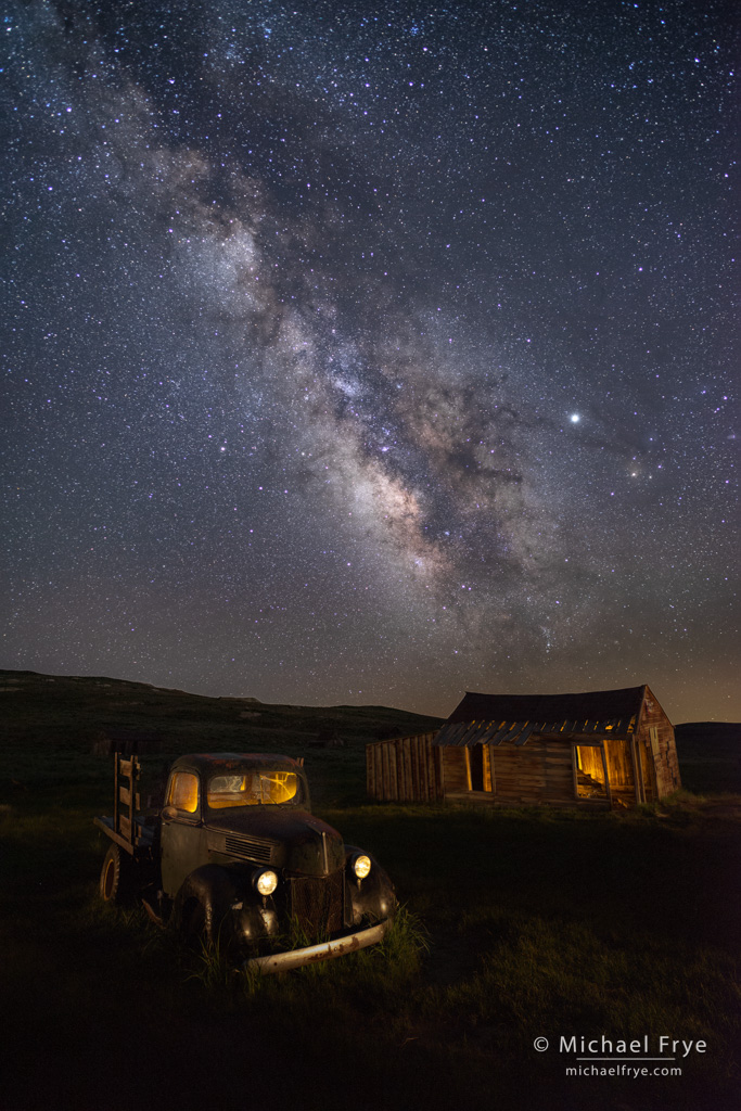 Old truck and shed underneath the Milky Way, Bodie. Nighttime photography can get pretty complex, often requiring multiple frames to reduce noise, or create intricate lighting. Here I captured twelve frames of the Milky Way, and blended them together with Starry Landscape Stacker to reduce noise. Then I took that image into Photoshop, where I blended it with seven light-painting frames – the truck from two sides, the shed from two sides, a frame for the interior lights (small lights placed inside the shed and against the truck windows), and two frames for lighting the headlights.