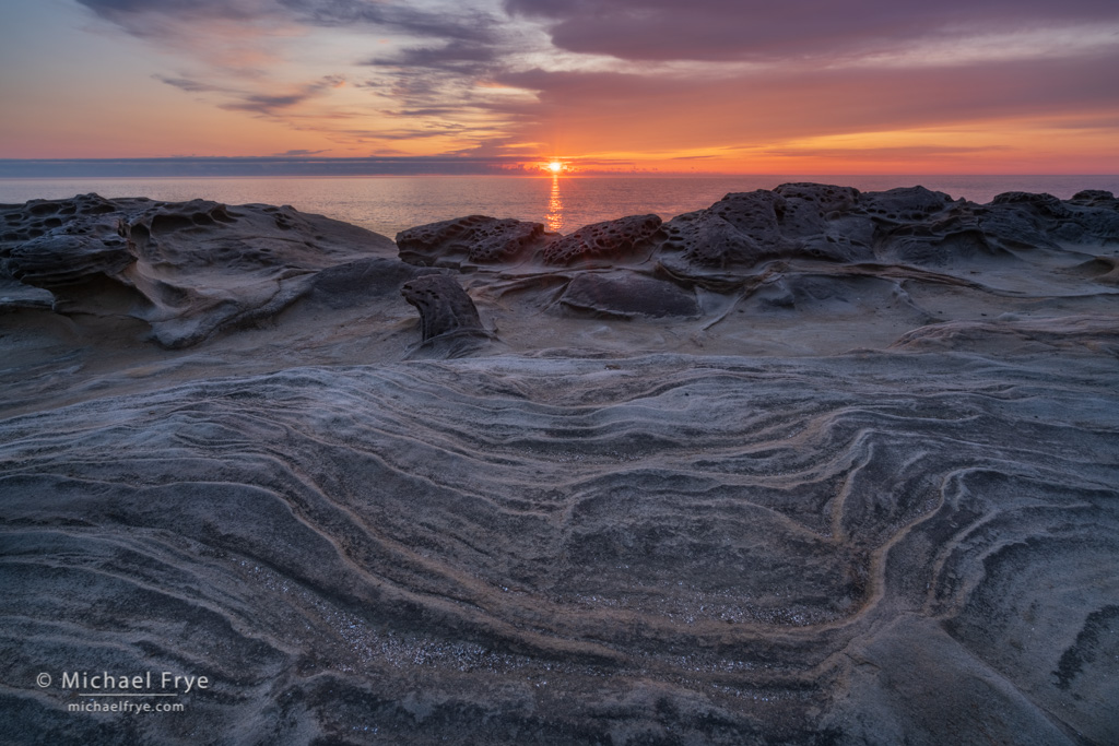 Sunset and sandstone formations, Oregon coast. 16mm, five bracketed exposures at f/16, ISO 100, blended with Lightroom’s HDR Merge, then blended back with one of the original images in Photoshop to eliminate ghosting.