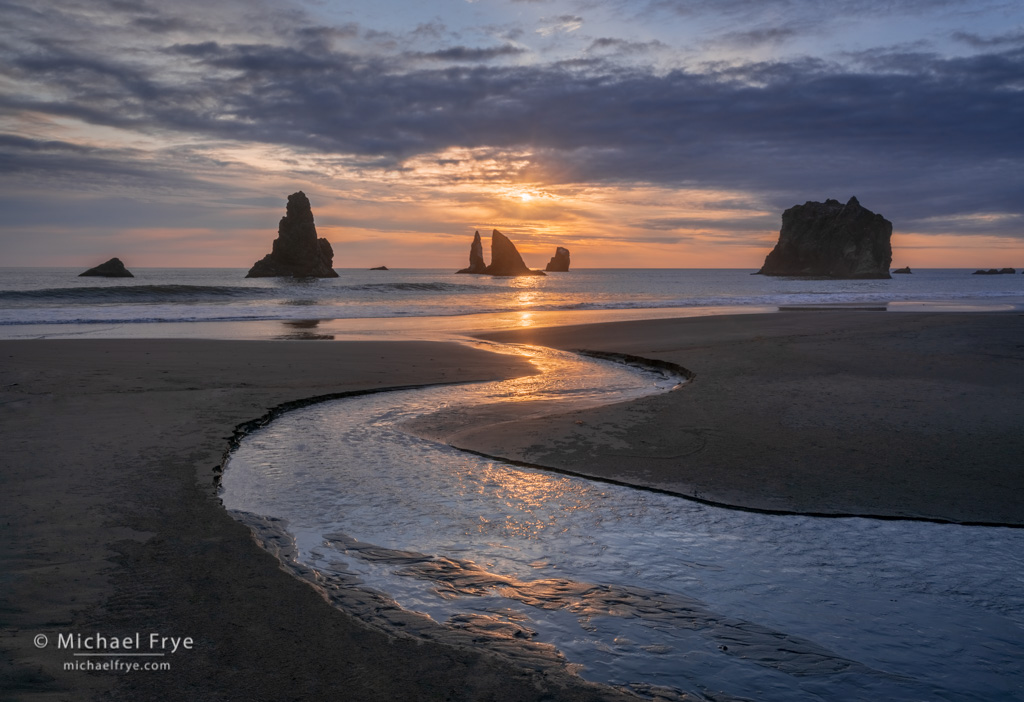 Creek flowing into the Pacific Ocean, Oregon coast. 26mm, five bracketed exposures at f/16, ISO 100, blended with Lightroom’s HDR Merge, then blended back with one of the original images in Photoshop to eliminate ghosting.