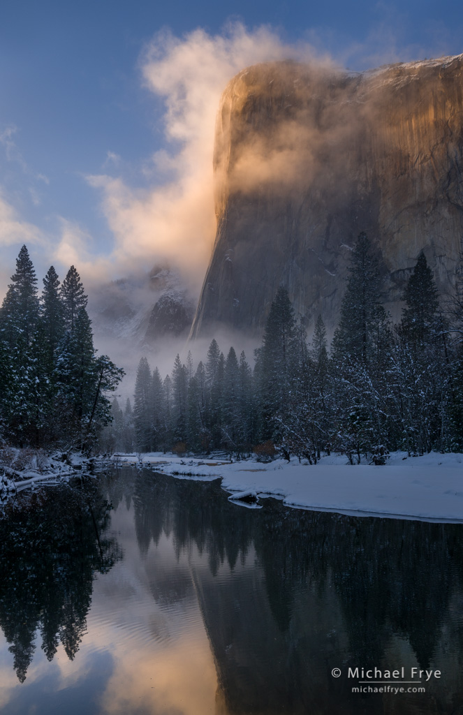 Several storms rolled through here last week. The largest of those dropped over two inches of rain in Yosemite Valley, and left a dusting of snow on the Valley floor Friday morning, but I couldn’t get up there early that day because Highway 140 was closed by mud and rock slides in the burn scar from the Ferguson Fire.