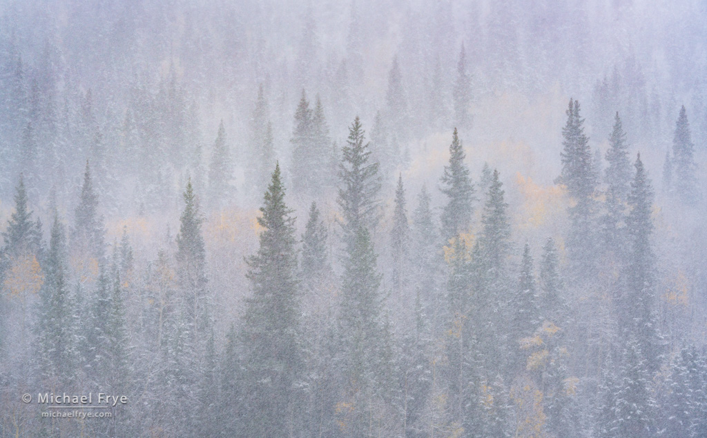 Aspens and conifers in a snowstorm, Colorado. 120mm, 1/125th of a second at f/11, ISO 400.