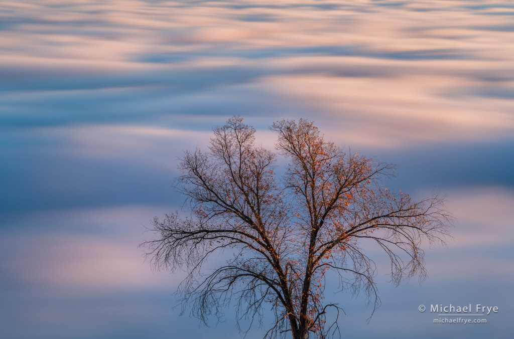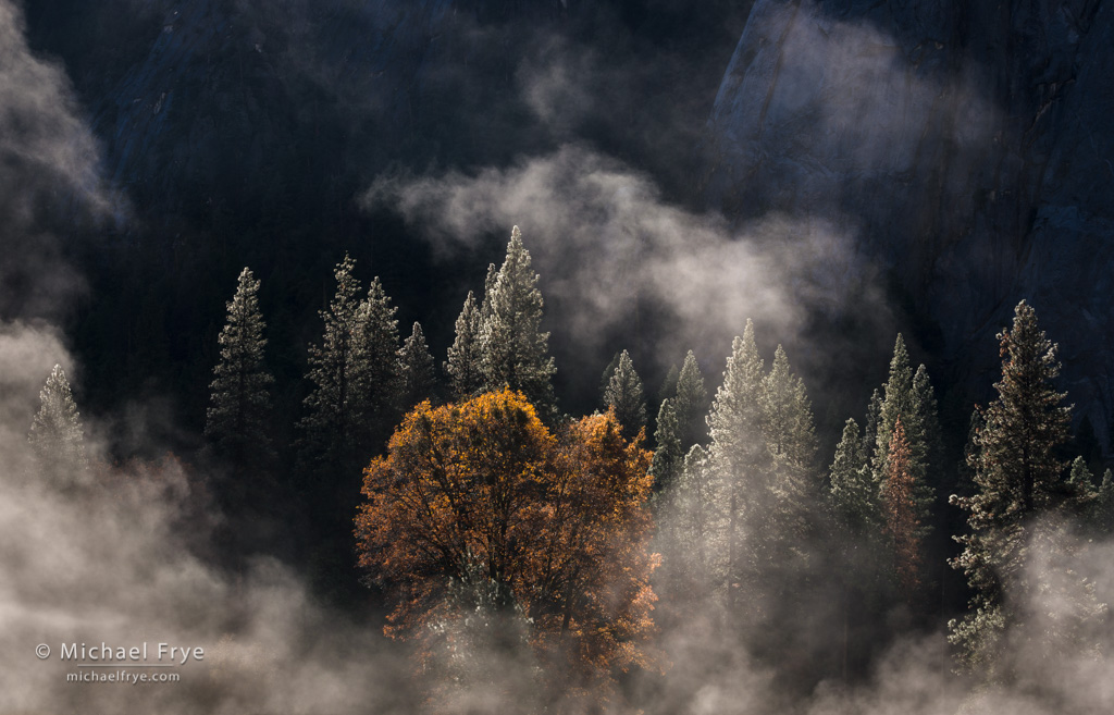Over Thanksgiving weekend I photographed a beautiful, misty morning in Yosemite Valley (see this previous post). Looking through my photographs later I realized that almost every one was backlit. And that made sense, as mist looks wonderful with backlight. So do other translucent objects like clouds, leaves, grasses, flowers, raindrops, and so forth.