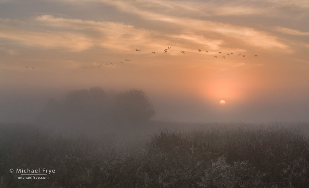 Sandhill cranes at sunrise on a foggy morning in the San Joaquin Valley, CA, USA