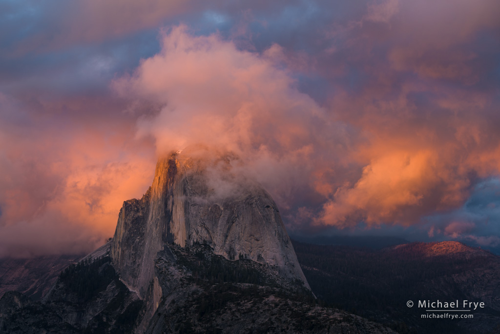 Several storms rolled through here last week. The largest of those dropped over two inches of rain in Yosemite Valley, and left a dusting of snow on the Valley floor Friday morning, but I couldn’t get up there early that day because Highway 140 was closed by mud and rock slides in the burn scar from the Ferguson Fire.