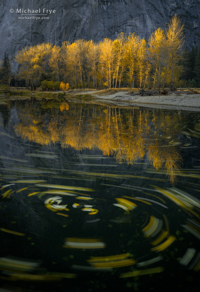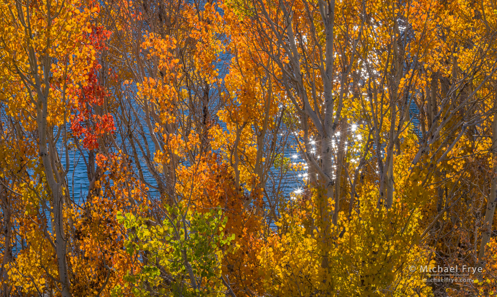 I’m working on a longer post, but in the meantime here are some more autumn colors, this time from the eastern Sierra about ten days ago. This image was actually Claudia’s idea. It’s difficult to photograph directly toward sunlit reflections like this, but she liked the color palette of yellow, orange, green, red, and blue, so I decided to try it, and somehow it worked.
