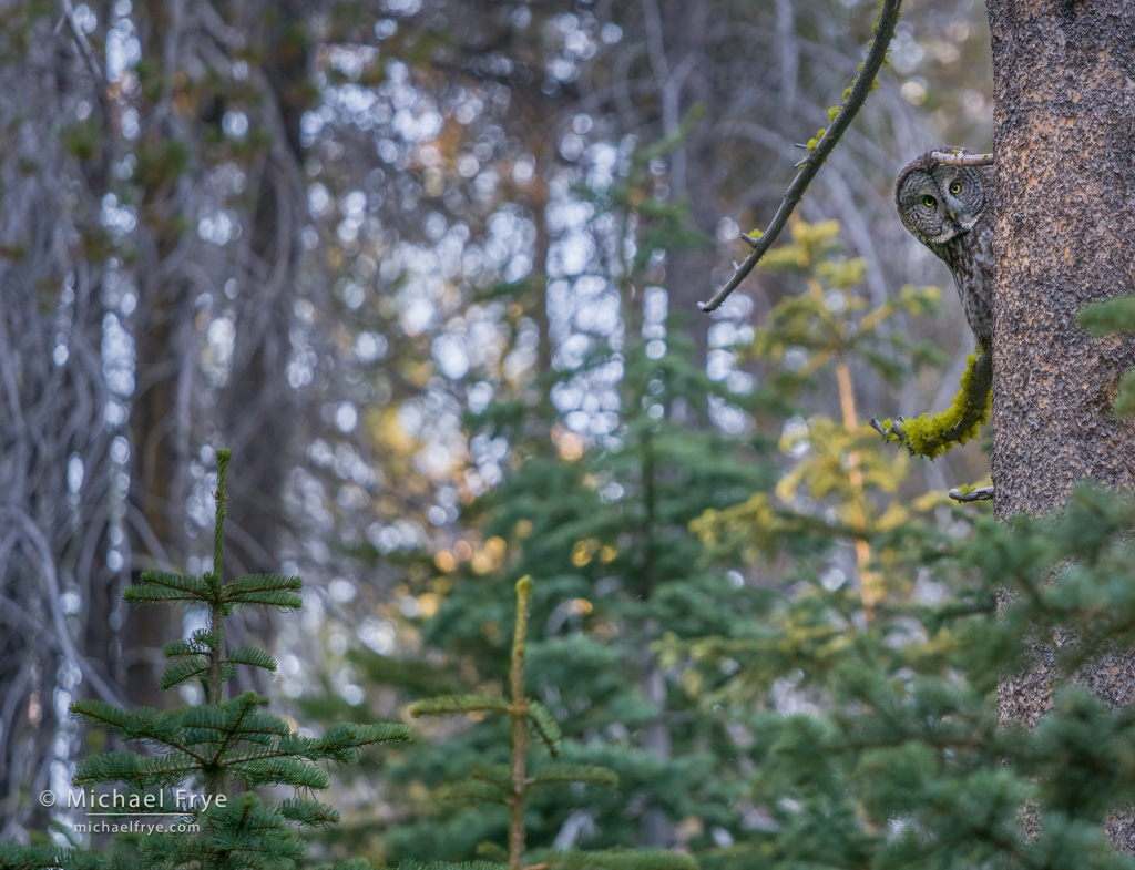 Great gray owl, Yosemite. This was what my first view looked like as the owl as craned its neck around the trunk and stared back at me.