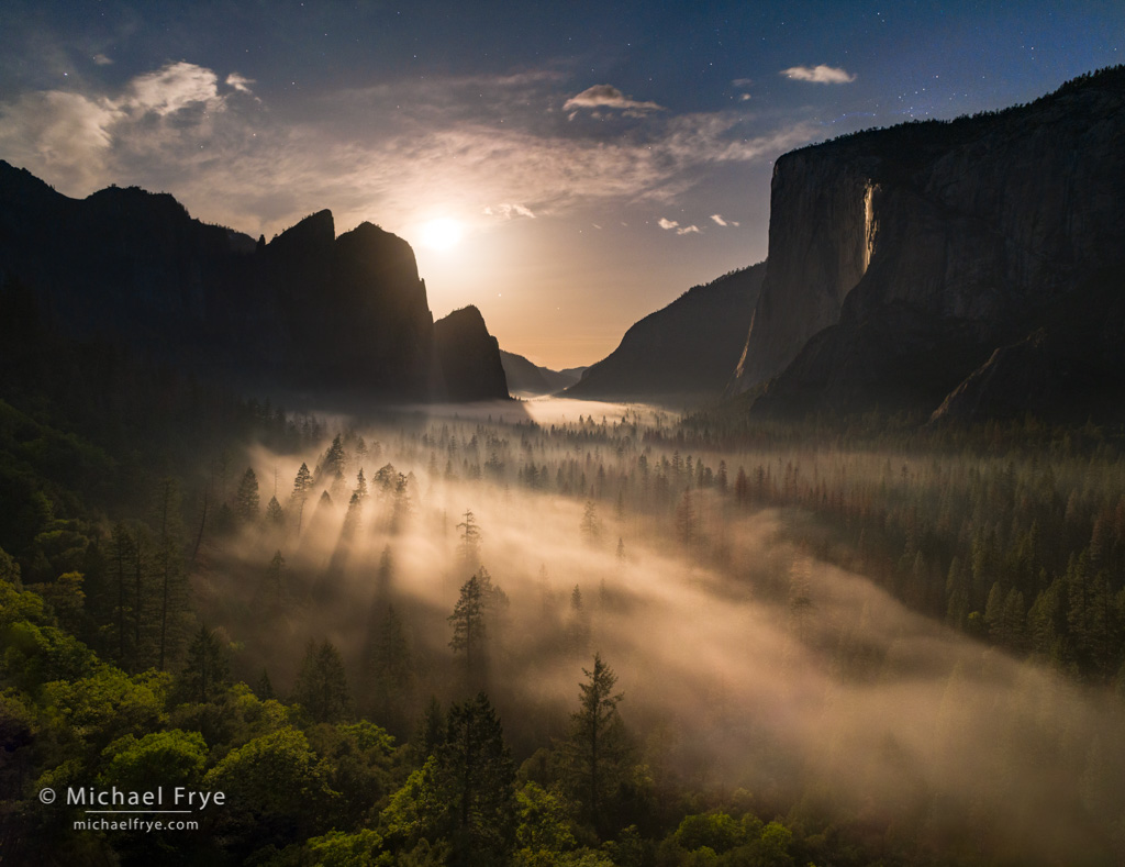 Some years ago it occurred to me that the setting moon could create the same effect. In the spring of 2010 I had a chance to try this, and it worked beautifully. As I wrote back then, I walked up to one of my favorite Horsetail Fall viewing locations early in the morning, and saw an amazing sight: that beautiful, low-angle backlight on the waterfall, with the cliff behind it in the shade. It looked like sunset in February, only with stars in the sky above it. And the camera captured what my eyes couldn’t see – the orange glow created by the setting moon: