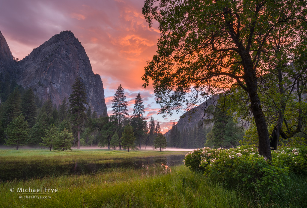 By the time we got to El Cap Meadow the sky was already starting to get interesting, so I had to hurry. My previous explorations gave me a head start, but I still had trouble finding a good composition that included azaleas, the sky, and, preferably, Lower Cathedral Rock. There was also some mist along the Merced River in the distance, and ponds reflecting the sunset, so I wanted to include those elements too, if possible.