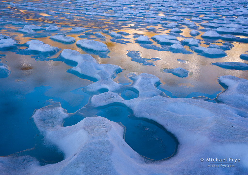That meant we couldn’t get to certain locations during the workshop, but as compensation we got to photograph roaring creeks and rivers, and partially-frozen lakes. When frozen lakes melt you can often find beautiful patterns where ice and snow mix with patches of open water. On the last evening of the workshop we went to Saddlebag Lake, which had some amazing ice patterns. Better yet, the ice went into the shade around 6:30 p.m., while the rusty-colored mountainside on the opposite side of the lake stayed in the sun for another hour, casting beautiful gold and orange reflections in the water. This was kid-in-candy-store stuff to someone who likes abstracts as much as I do.