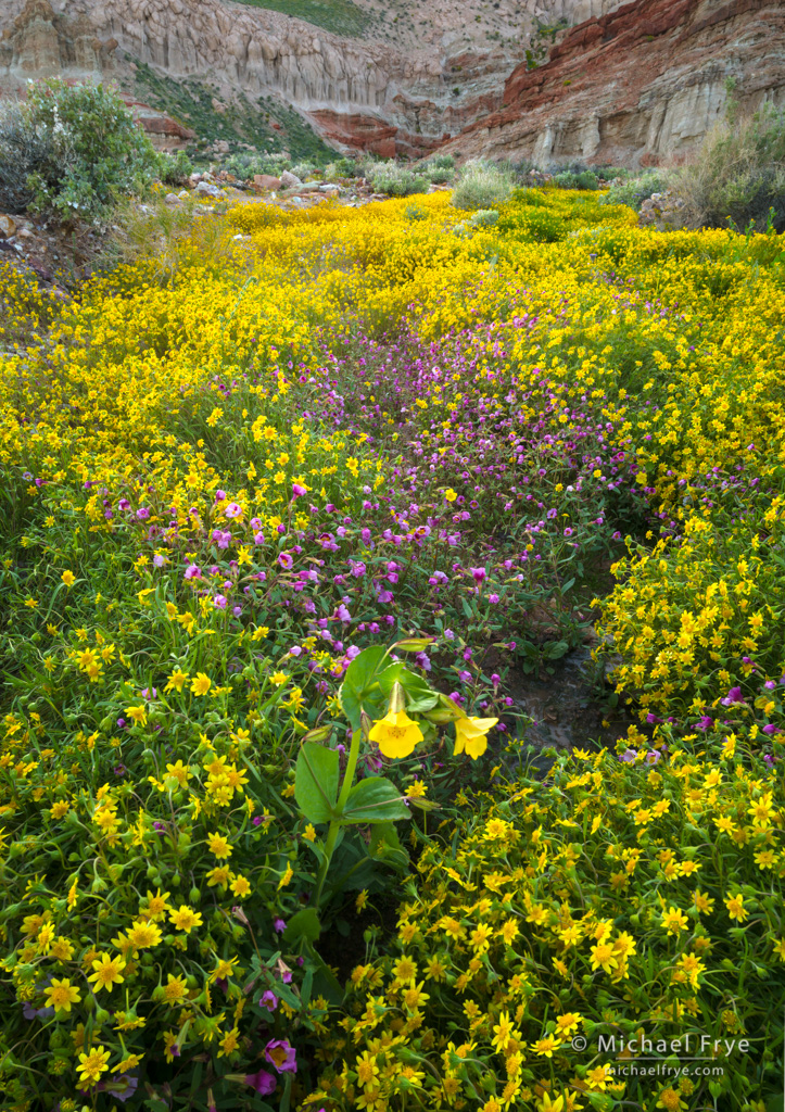 This composition is built around the two yellow monkeyflowers about a third of the way up from the bottom of the frame. When I spotted these two flowers I knew they would provide a great focal point – something for the viewer’s eyes to latch onto before roaming through the colorful mass of blossoms behind them to the red rocks beyond.