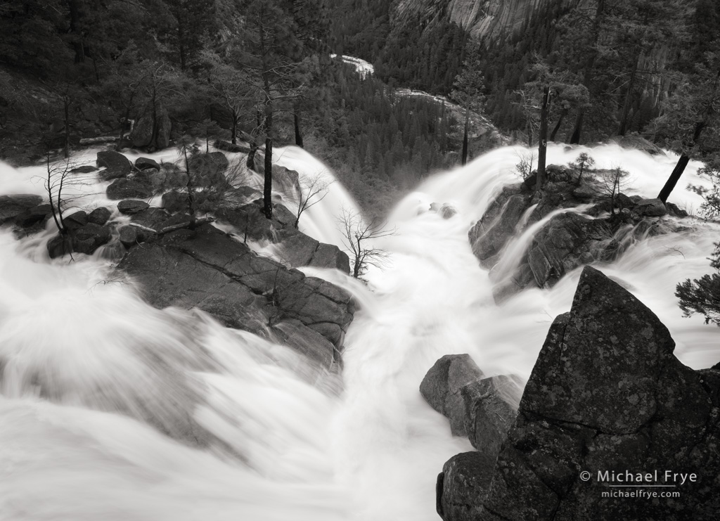 My brother Peter came down to visit us from Washington state, and early on Thursday morning we drove up to Yosemite Valley, hoping for the sun to break through. We never saw the sun, but we found innumerable small waterfalls, including many I don’t remember seeing before in over 30 years here. And the big waterfalls were ripping. The overcast light was actually the perfect complement to many of these scenes, and I didn’t know when I’d get another opportunity to photograph the waterfalls like this, so we ended up staying in the valley for most of the day photographing the surging cascades.