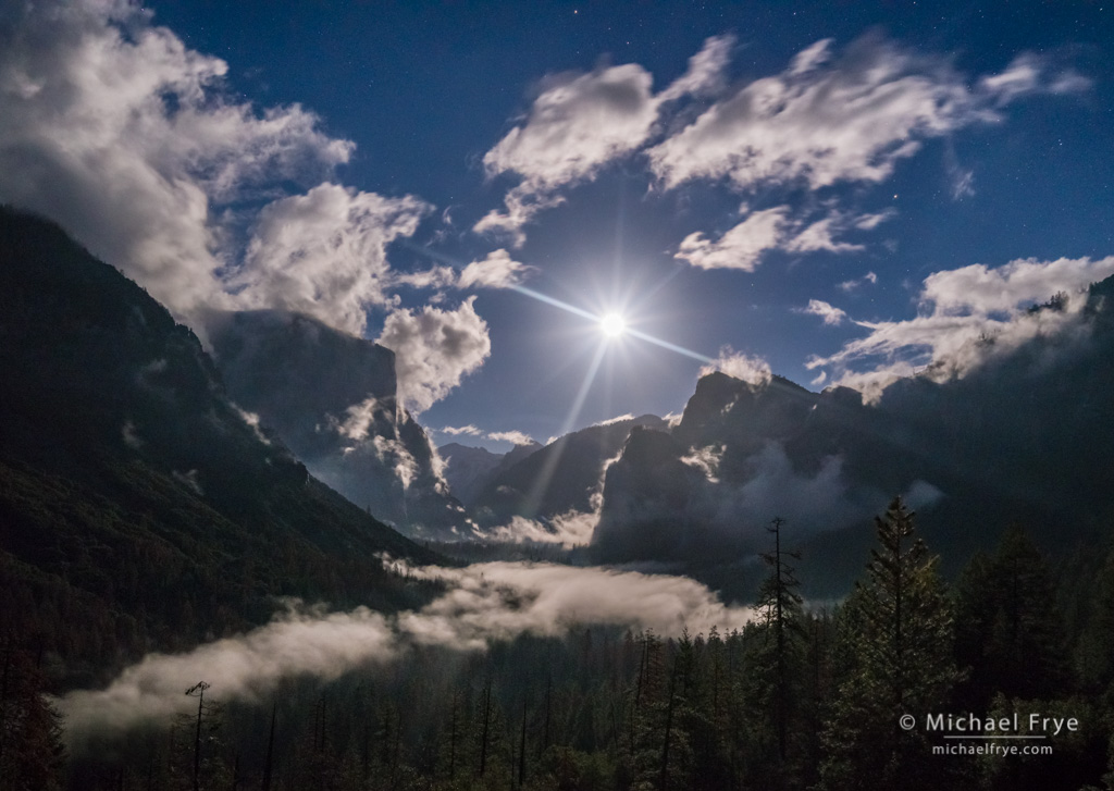 I made this photograph on the same night as the moonrise from Gates of the Valley image in my last post. After leaving the Gates I headed up to Tunnel View. For some reason I thought the moon would be behind Cathedral Rocks from there, but instead the moon was plainly visible right over the valley. I would usually avoid photographing right into the moon, for the same reasons I would usually avoid photographing right into the sun: a high probability of lens flare, and extreme contrast. But on that night the backlit mist and clouds were beautiful, so I gave it a try.