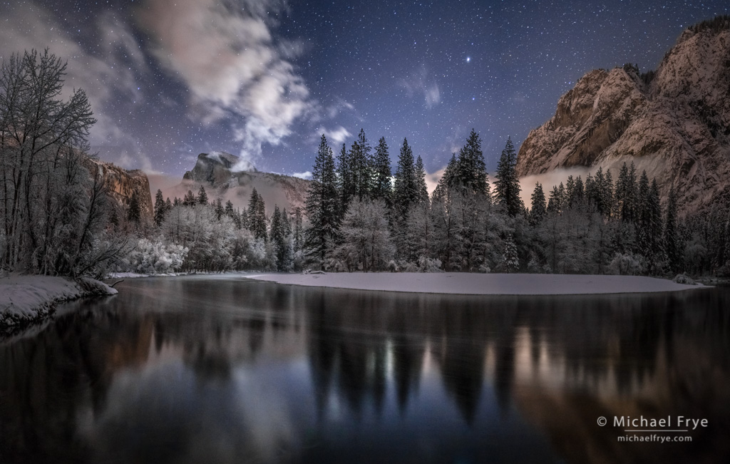 I made this image around 4:20 a.m. last Saturday morning (Christmas Eve) after a few of inches of snow fell in Yosemite Valley. I actually drove up to the valley around 9:30 on Friday evening, since it looked like the storm was about to clear. But clouds and snow flurries persisted for awhile, and skies didn’t start to clear in ernest until after midnight.