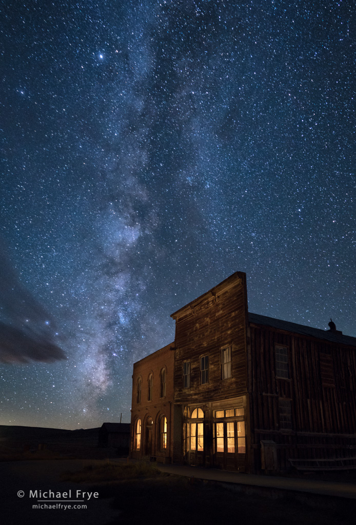 On the last night of our recent Starry Skies Adventure workshop we went to Bodie, which is always a great place for night photography. As the Milky Way moved into the southwest that evening it lined up well with these two buildings along Main Street, the DeChambeau Hotel and I.O.O.F. (Independent Order of Odd Fellows) Hall. I had never photographed this view of Bodie before so decided to try it, and was joined by several other people in the workshop.