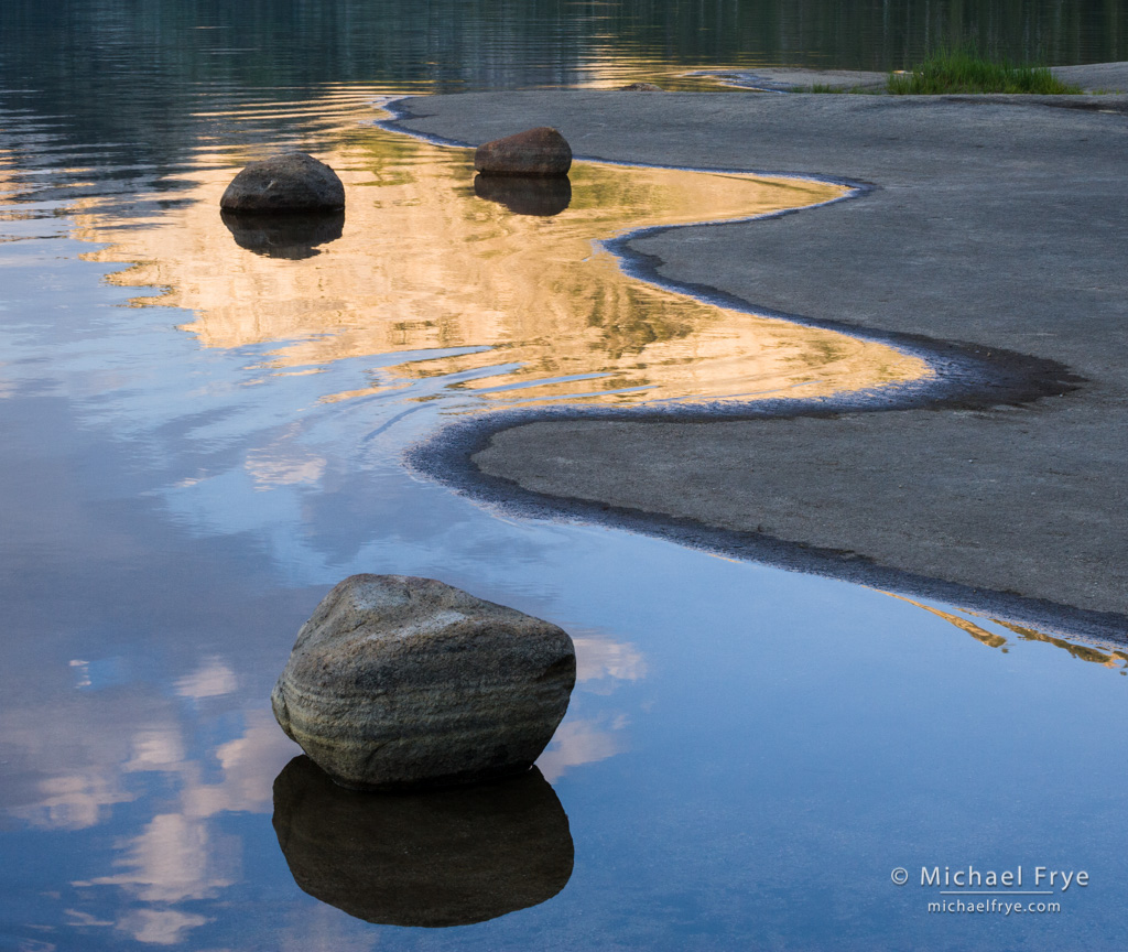 Rocks and reflections along the shore of Tenaya Lake, Yosemite. This image features both curves and circles.