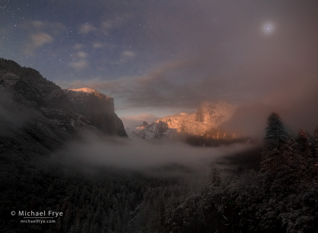 This is another moonlit photo from Saturday night (actually early Sunday morning). After making the image Gates of the Valley that I posted on Sunday, I headed up to Tunnel View. When I arrived the valley was hidden by a thick bank of fog, but eventually the mist parted, revealing stars, Jupiter, and cliffs lit by the setting moon. Claudia thought this had a Christmas feeling to it, and I had to agree, so it seemed like an appropriate photograph to post today.