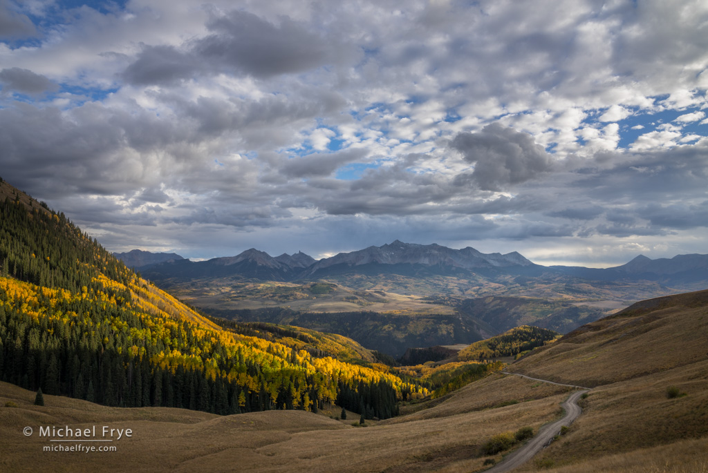 Here’s a photo from last week near Red Mountain Pass, outside of Ouray. This was made before the wind storm, but this is a high-elevation, early-changing spot, so some of the leaves had already fallen. Sometimes, however, a mixture of colorful leaves and bare trees is more interesting than just a mass of color; in this case the bare patches helped to make the diagonal lines of color stand out and create a pattern.