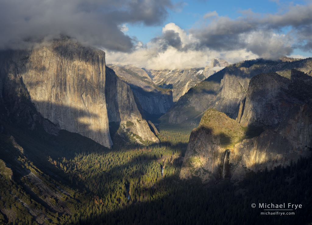 Knowing this, I watched the weather closely on Monday. Some showers moved through, and it seemed like the last chance of seeing interesting clouds for awhile, so I decided to hike up above Tunnel View to a spot near Old Inspiration Point (I’ve described previous journeys up this trail here and here). I got there in time to catch one moment with beautiful cloud shadows. I especially like the shadow near the bottom of El Capitan (in the photo above).
