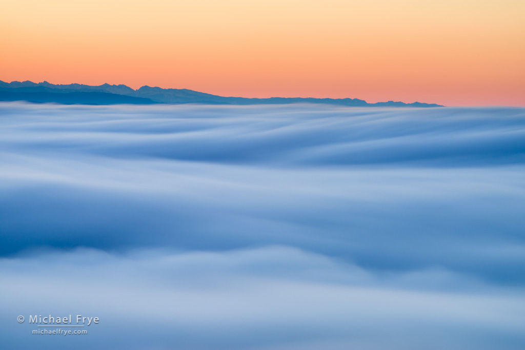 That sight should be familiar to people who live in the San Francisco Bay Area, or anywhere along the California Coast. When I lived in the Bay Area in the early ’80s, I remember driving along Skyline Drive on the Peninsula and looking out to the west over a sea of fog covering the ocean. At that time my interest in photography was in its infancy, but it was a beautiful sight. I’ve had that mental image in my mind ever since, and have long wanted to make photographs from above a sea of fog.