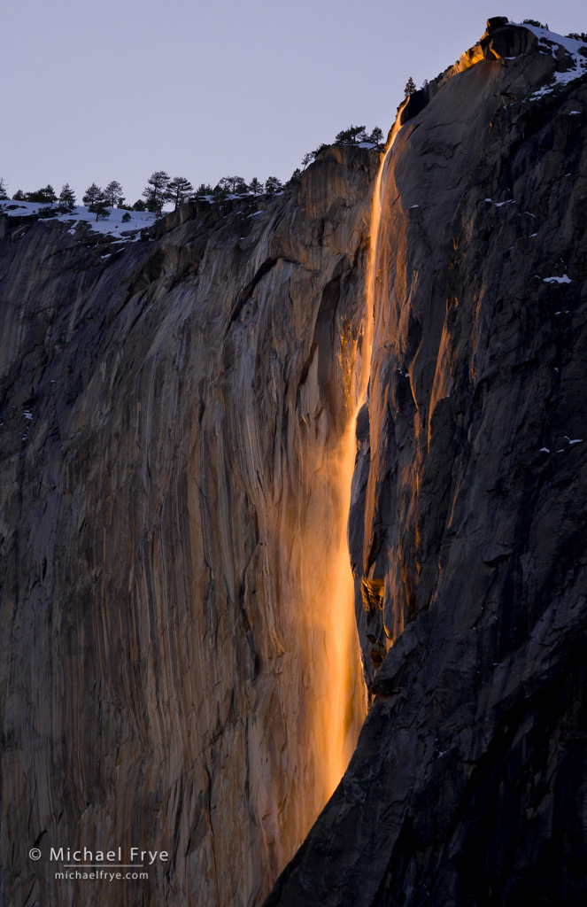 The first wave of rain arrived Friday night, and lingered through Saturday. Early Sunday morning I looked at the satellite and radar images online, and saw thin, high clouds moving in ahead of the next system. Thinking that those clouds might light up at sunrise, I made the trip up to Tunnel View. Soon after I got there a bit of color appeared behind Half Dome, and then within minutes the whole sky caught on fire. It turned into the most colorful sunrise I’ve ever seen from that spot; you can see a photograph above.