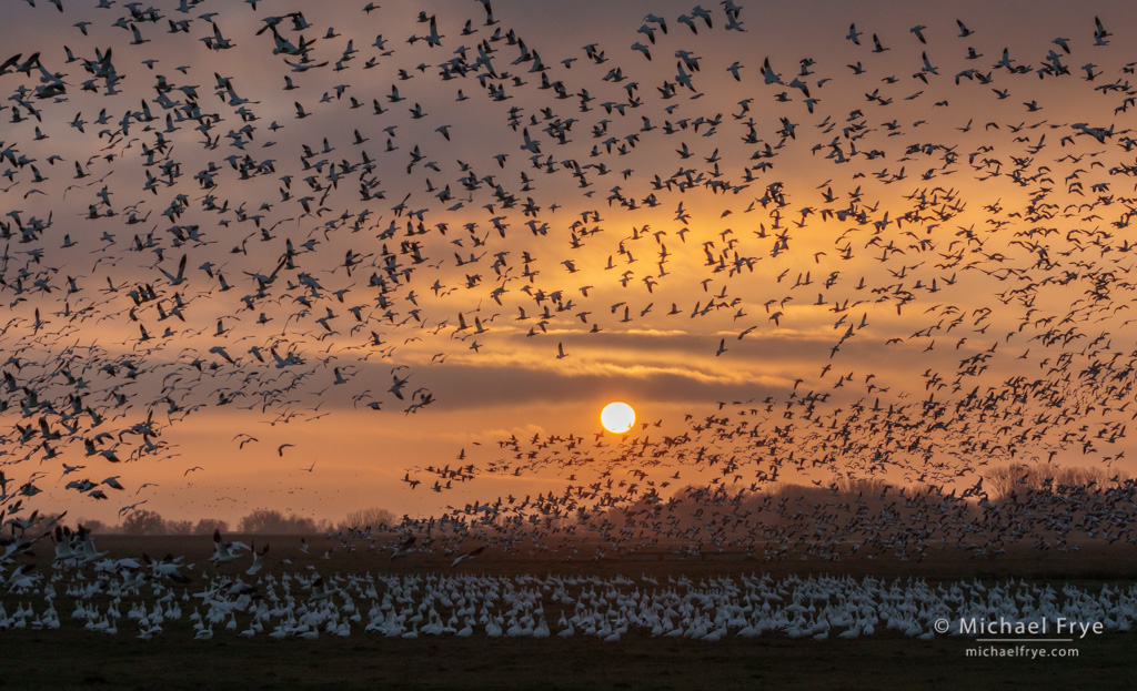 I’ve been working on a book deadline, so haven’t been able to get to Yosemite Valley and check on Horsetail Fall recently. But I did break away from the desk on Friday to go down to the Central Valley and photograph birds. At first the light was rather uninspiring, because the fog I was hoping for had lifted into a low overcast. But it turned out to be a great day. I photographed one of the biggest goose takeoffs I’ve ever seen, with perhaps 30,000 birds lifting off at once; one of the photographs below shows part of that group. Later, the sun broke through the stratus deck to create some beautiful sunbeams, and at dusk Venus and the crescent moon appeared (above).