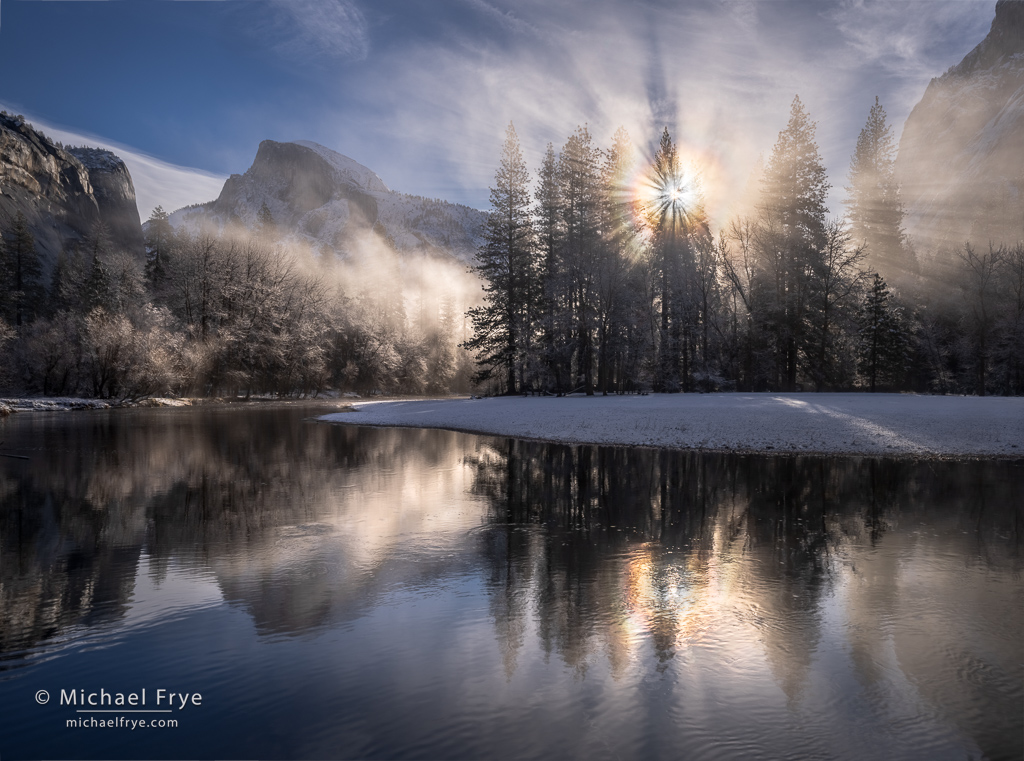 On a Sunday morning nine days ago I headed up to Yosemite Valley as a small storm was clearing. This system was on the warm side, so it rained at the valley elevation (around 4,000 feet). But there was still some snow on the ground from previous storms, and rain on top of snow is a fog-generating machine, so I figured there would be lots of fog and mist.