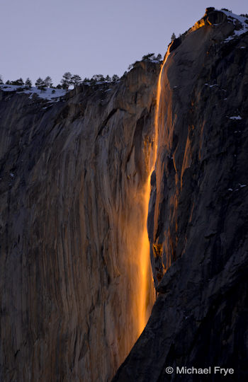 The accompanying photographs were made on Wednesday and Thursday evenings while I was teaching private workshops, and show the current conditions pretty well. On Wednesday some mist drifted past the fall, adding interest, but distant clouds dimmed the light before it reached its most intense color. On Thursday, the light was about as good as it gets for Horsetail, lasting right until the theoretical sunset time, with the cliff behind the fall shaded. If only there was more water!