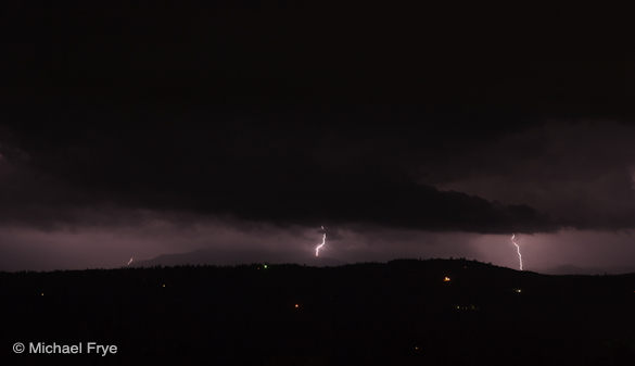 Even though we planned to head over Tioga Pass to Bishop the next morning, and needed to get up early, we decided to go out and take a look. We drove to a spot on Triangle Road, less than half a mile from our house in Mariposa, with a panoramic view to the south. From there we could see that flickering behind a ridge to the west, but also an even more intense thunderstorm to the south, near Fresno. This second cell put on a great light show, with nearly continuous flashes. It gradually moved closer, then slid by to the east, so we were able to watch it for over two hours.