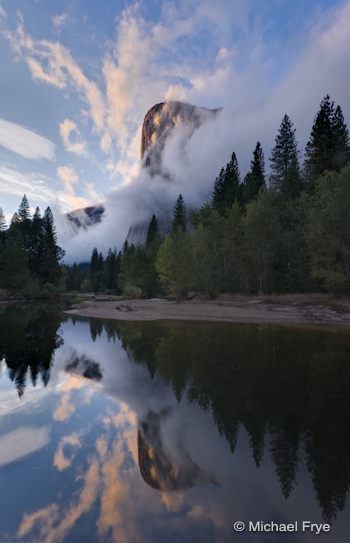I had to console myself by photographing a beautiful, seldom-visited location: Yosemite Valley. After receiving almost two inches of rain since Friday, skies cleared over the valley Tuesday, and I was able to photograph El Capitan at sunset surrounded by mist and clouds.