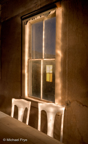 Bodie, of course, has lots of great subjects for doing all these things, but at first I found it difficult to find the right subject and composition. When faced with a new situation it sometimes takes awhile to find your bearings. Eventually I found the composition shown here, in the often-photographed Miller House, and captured an image I’m reasonably happy with. I tried various techniques to light the chairs and interior. This version includes light from two different flashlights, as well as moonlight spilling in through the window, and a lamp illuminating a window in another building. (Some of the park staff actually live in Bodie, so this light came from one of the staff member’s houses.)