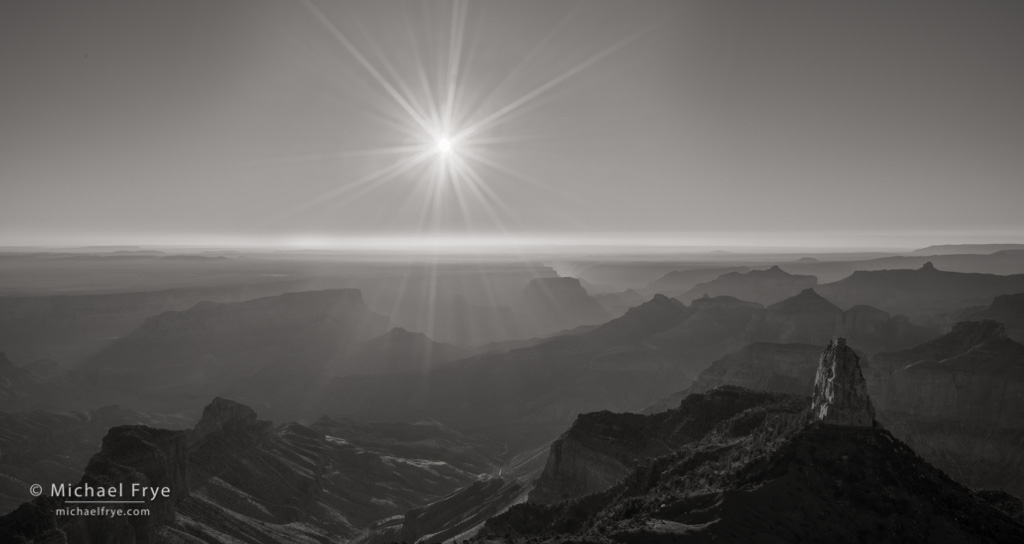 Morning sunlight from the North Rim of the Grand Canyon, Arizona. I used the “thumb technique” to reduce flare in this image; see the post for more details.