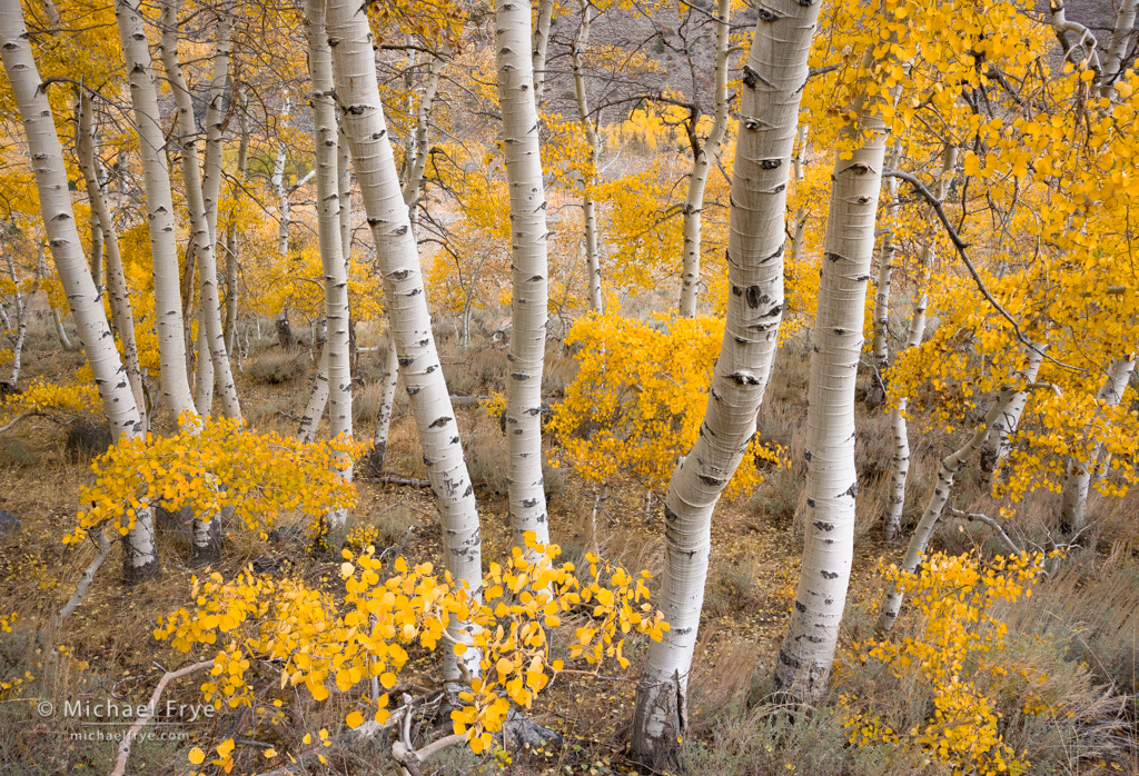 Late-October aspens near Silver Lake, June Lake Loop, Inyo NF, CA, USA. I used f/16 to get everything in focus in this 2008 photograph from the eastern Sierra. (The shutter speed was 1/6th second, the ISO 400.)
