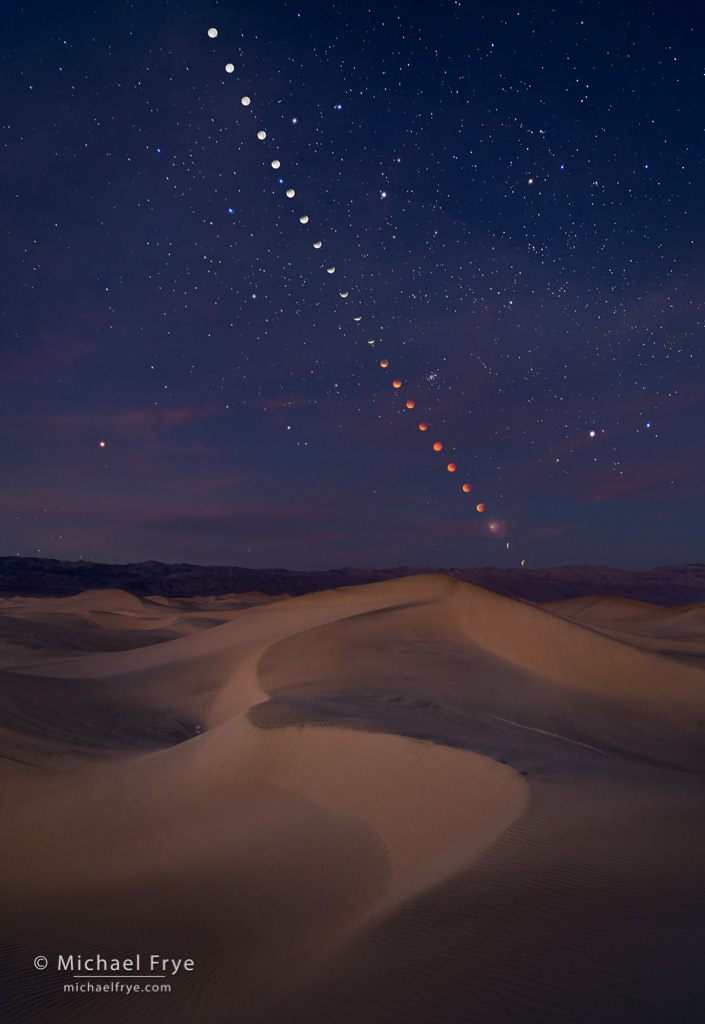 Lunar eclipse sequence over the Mesquite Flat Dunes, January 31st, 2018, Death Valley NP, CA, USA