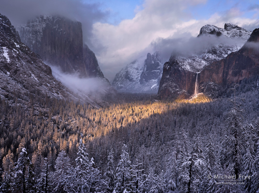 I hope you’re all enjoying the season. This is a photograph from a few years ago of a quintessential Yosemite winter scene, with snow falling out of the trees as it’s warmed by the sun.