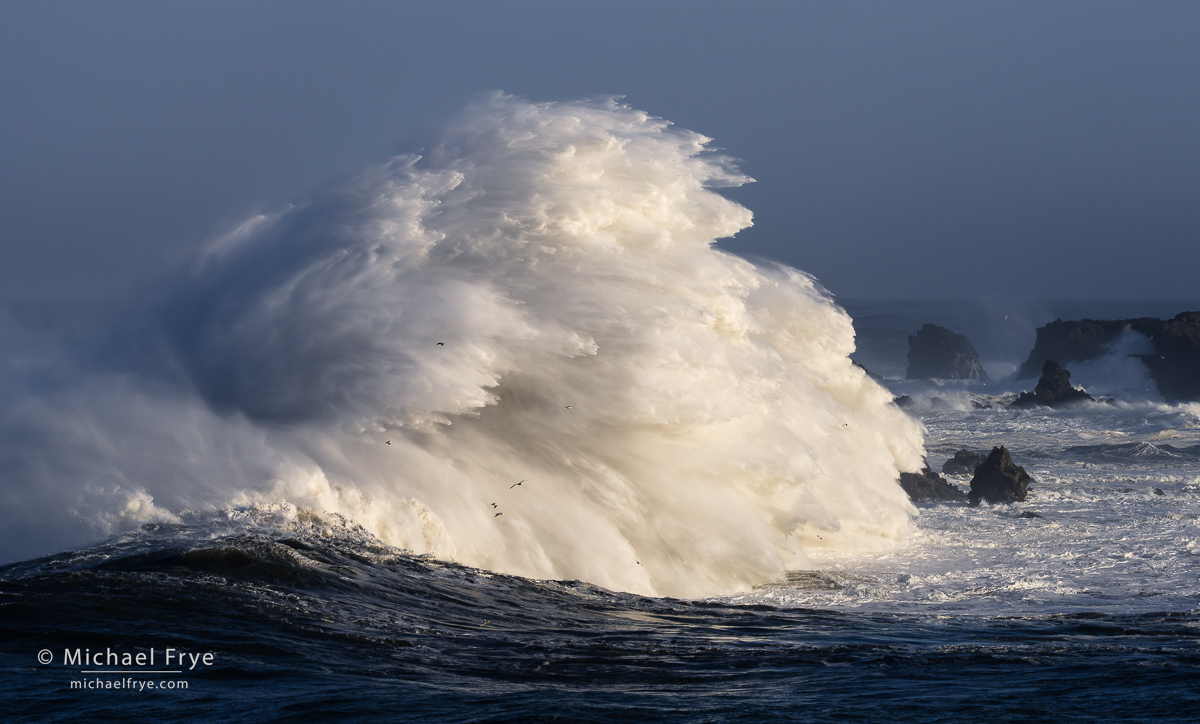 Breaking wave, Oregon Coast (from last Wednesday morning). This is one of the largest wave splashes I’ve ever seen. Note the gulls in front of the wave (you can click on this to see it larger). 192mm, 1/500 sec. at f/16, ISO 640.