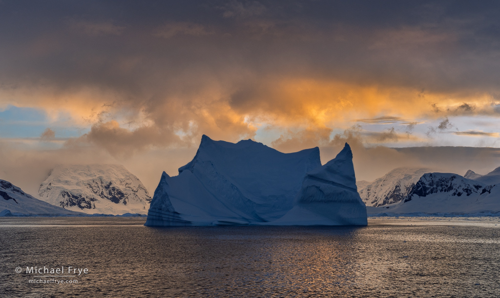 Iceberg at sunset, Antarctica. As if putting on a grand finale, we passed a large, beautifully-shaped iceberg just after sunset, with colorful clouds lingering in the sky to the south.