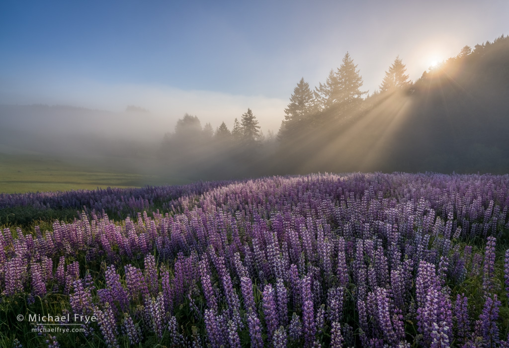 Sun rising over a field of lupines, Redwood NP, California. The focal length was 16mm, and the closest objects to the camera were the flowers at the very bottom of the frame, about two feet from the lens. I used my hyperfocal-distance shortcut to find the optimum focus distance, by doubling the distance from the closest object and focusing at four feet. Then I stopped to down to f/16 to get enough depth of field to make both the foreground and background sharp. 16mm, three bracketed exposures at f/16, ISO 100, blended with Lightroom’s HDR Merge.